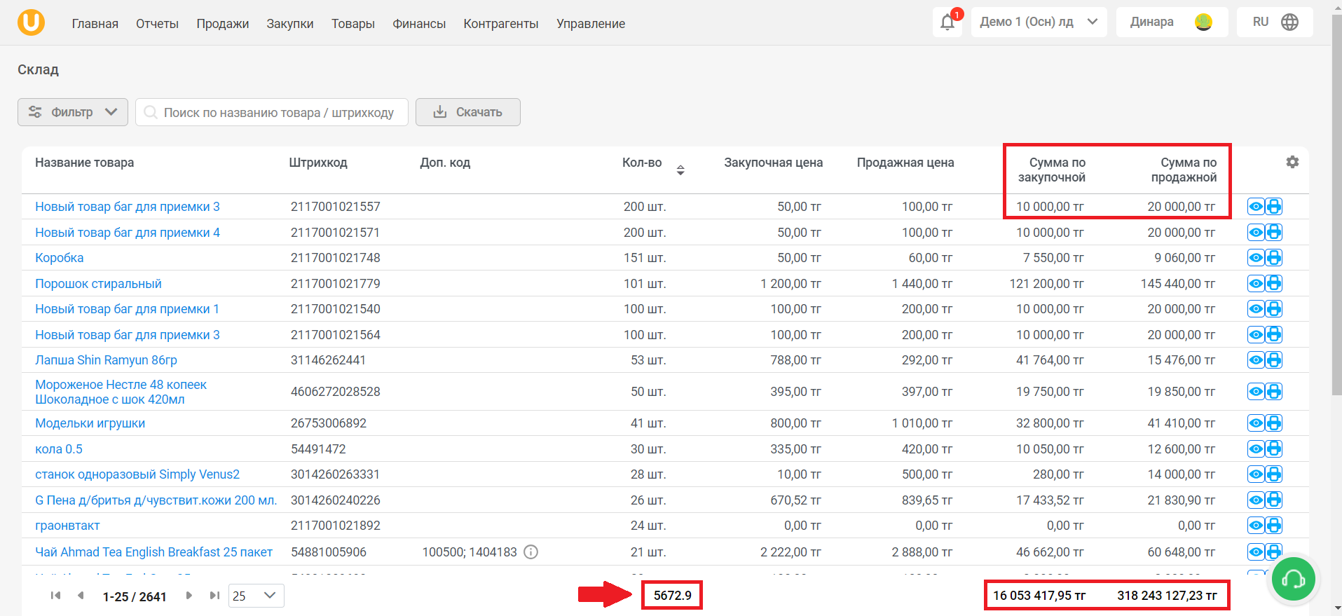 Также внизу страницы вы можете увидеть общее количество всех товаров на складе, общую сумму всех товаров по закупочной и общую сумму всех товаров по продажной ценам.