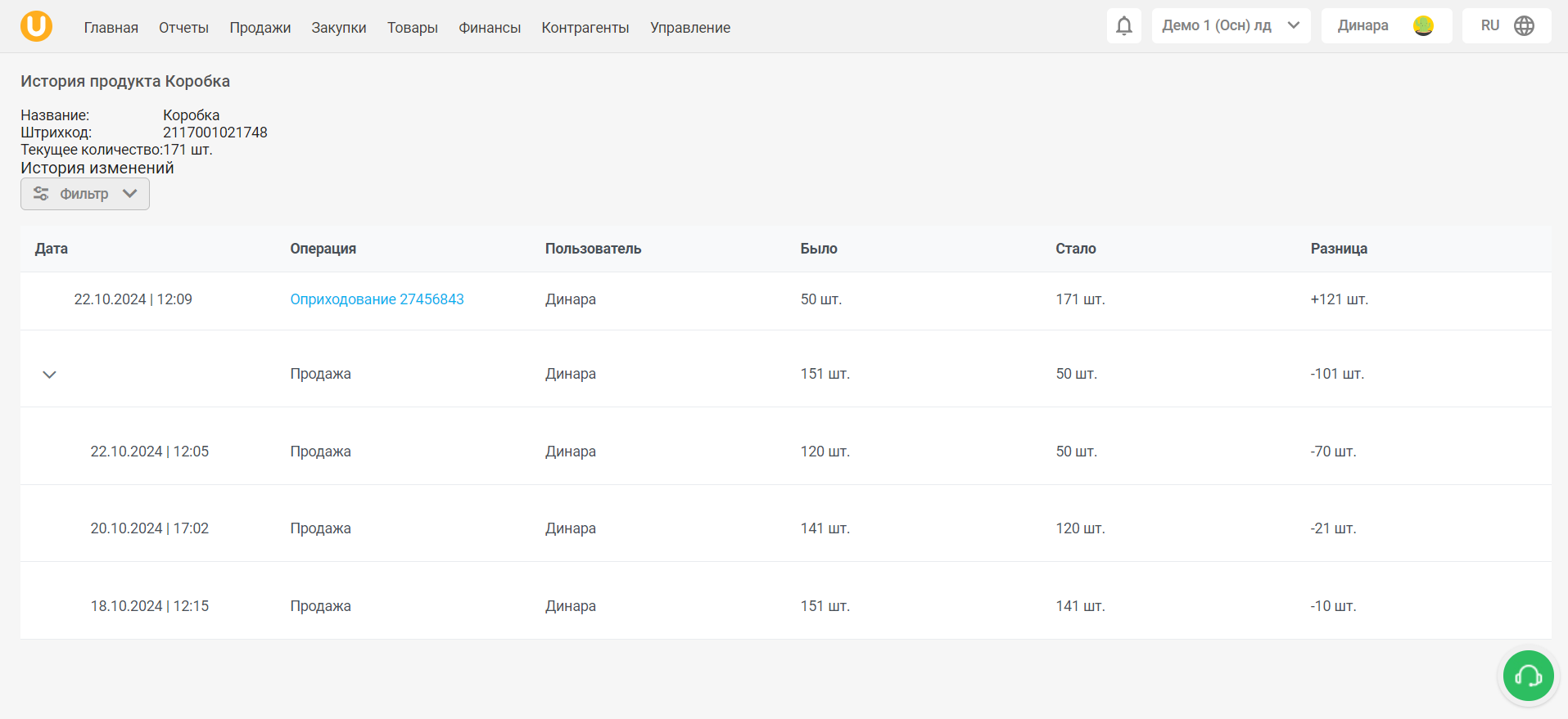 Откроется страница “История продукта”, в которой вы можете просмотреть историю движения товара и всех операций на складе.