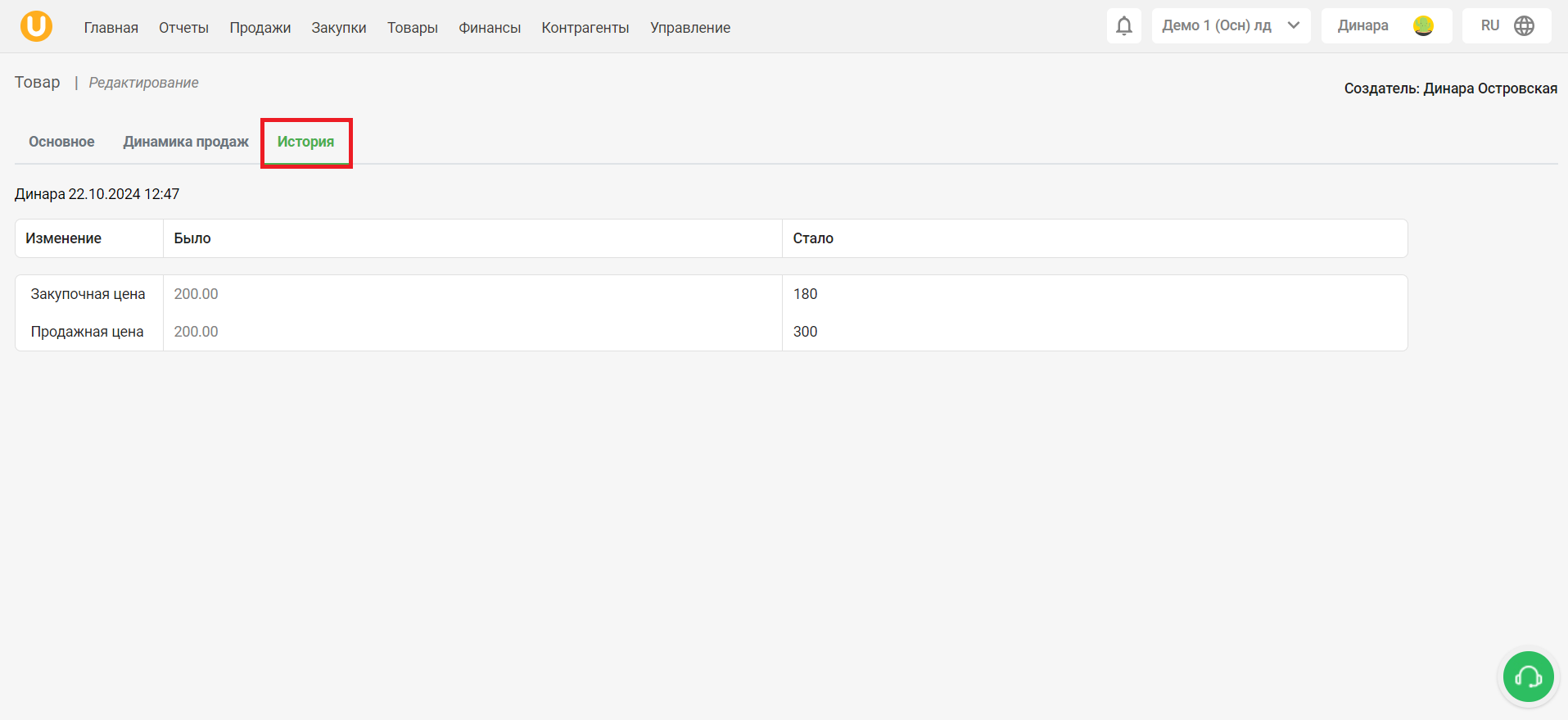 Во вкладке “История” вы можете посмотреть все изменения, происходившие с товаром с момента создания этого товара.