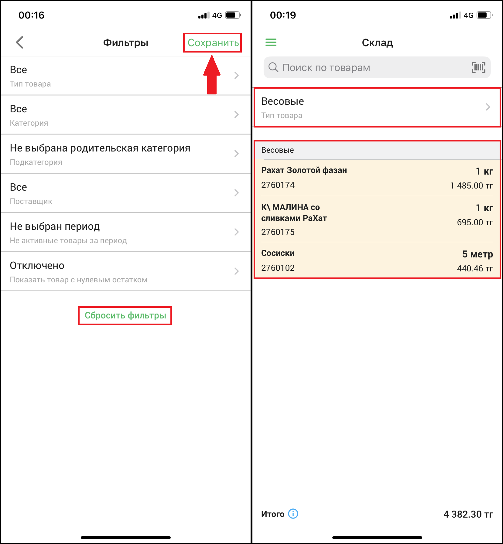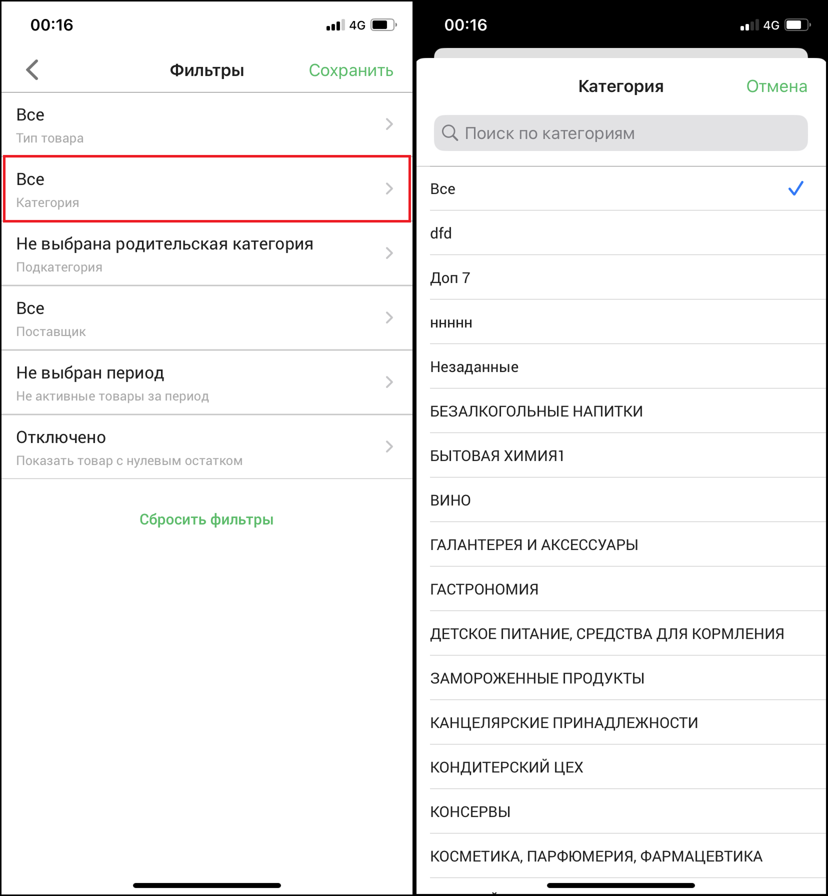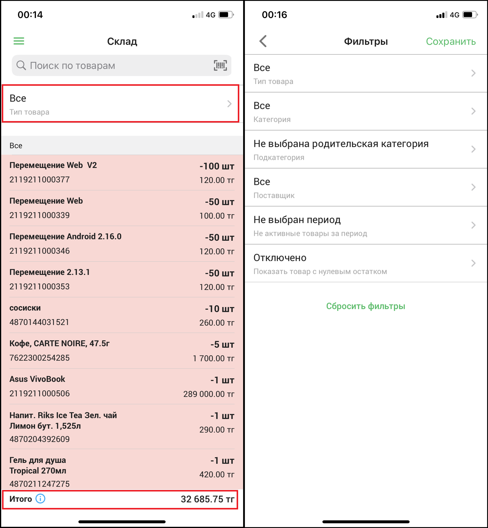 Фильтр упрощает поиск нужных вам товаров на складе. Для того, чтобы воспользоваться фильтром, на странице склада нажмите на кнопку “Тип товара”. Откроется страница “Фильтры”.