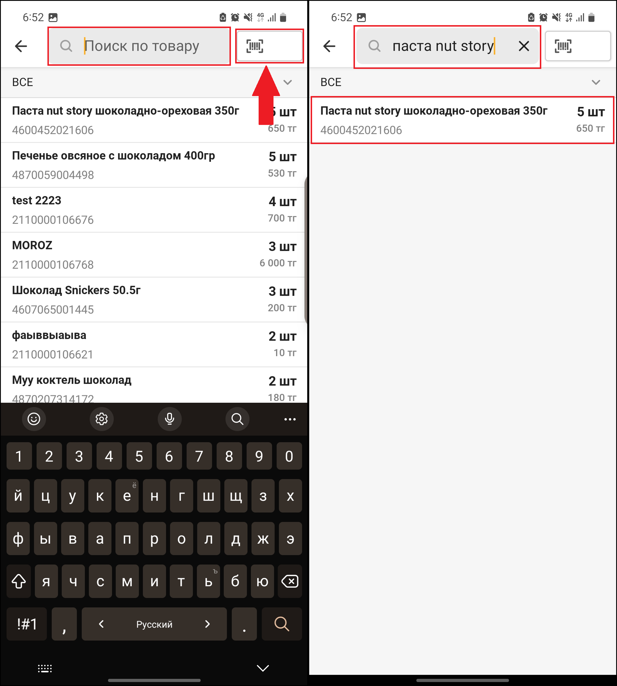 Для того, чтобы осуществить поиск по товарам, нажмите на кнопку “🔍” в правом верхнем углу страницы. Введите название товара, либо штрихкод. Также, вы можете нажать на кнопку сканирования штрихкода, чтобы отсканировать штрихкод товара, который вы хотите найти.