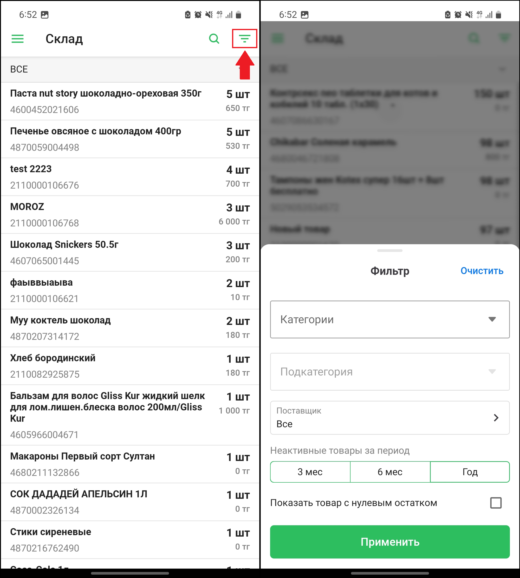 Фильтр упрощает поиск нужных вам товаров на складе. Для того, чтобы открыть настройки фильтрации, вам необходимо нажать на кнопку “Фильтр” на странице склада, после чего откроется окно с параметрами фильтрации. Внесите нужные вам параметры и нажмите на кнопку “Применить”.