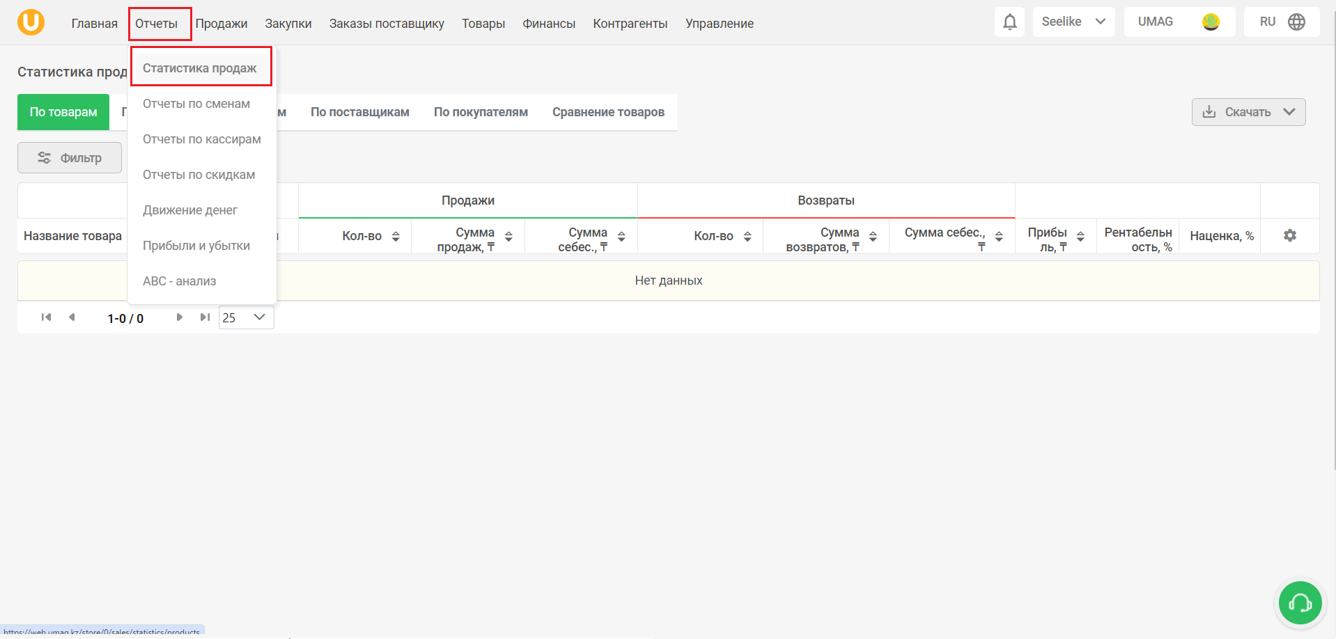 Для перехода на страницу "Статистика продаж" наведите мышь на “Отчеты” в верхнем меню, а затем в выпадающем списке нажмите на "Статистика продаж".