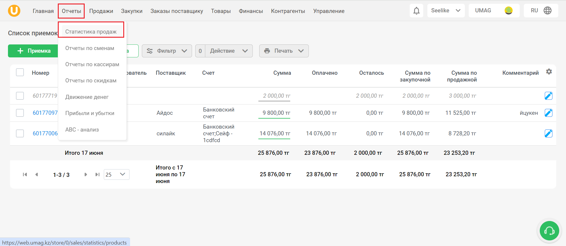 Чтобы перейти на страницу "Статистика продаж", откройте вкладку "Отчеты" в верхнем меню, затем в выпадающем списке выберите строку "Статистика продаж"