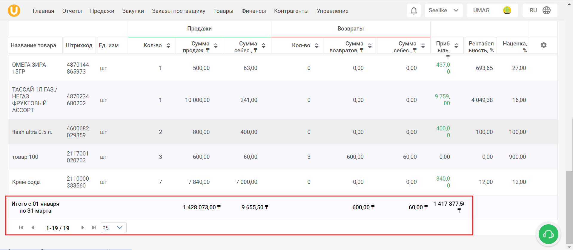 В нижней части таблицы показана итоговая сумма по столбцам за выбранный период по продажам, возвратам и прибыли выбранных товаров.