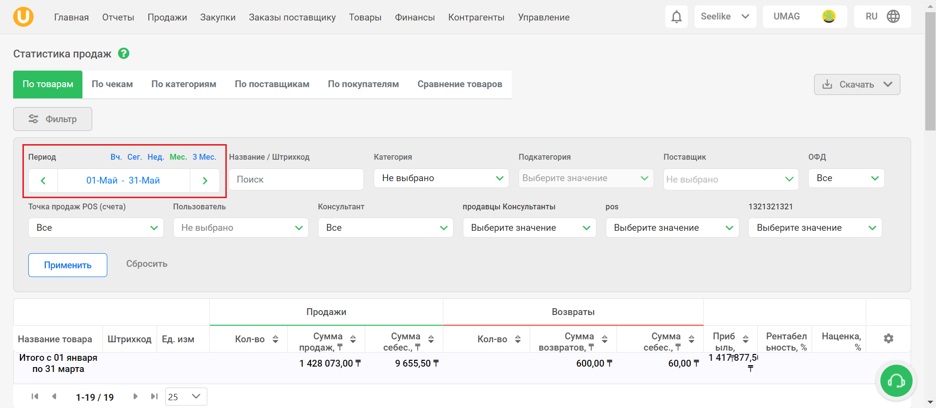 Для просмотра статистики продаж по различным критериям, таким как период, поставщик или точка продаж, просто нажмите строку с датой в верхней части вкладки. Выберите нужные критерии фильтрации в зависимости от ваших потребностей.