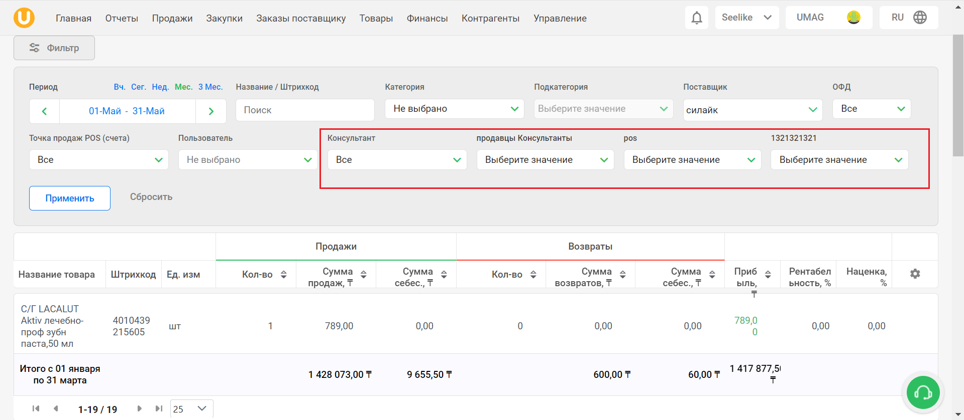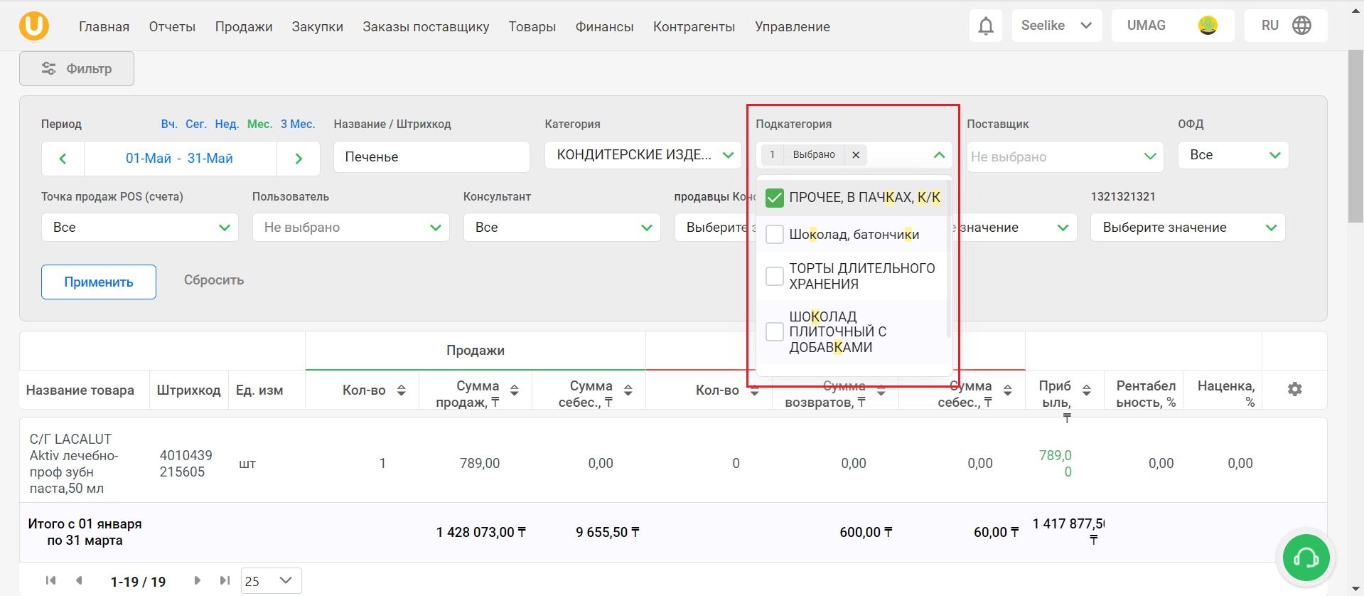 Например, вы можете выбрать определенный период времени, поставщика и точку продажи, чтобы получить информацию о продажах за этот период от этого поставщика в выбранной точке продажи.