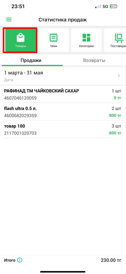 По умолчанию откроется статистика продаж и возвратов по товарам. Вы можете увидеть количество продаж и возвратов, общую сумму продаж и возвратов в разрезе товаров. Товары представлены по наименованию и штрихкоду.