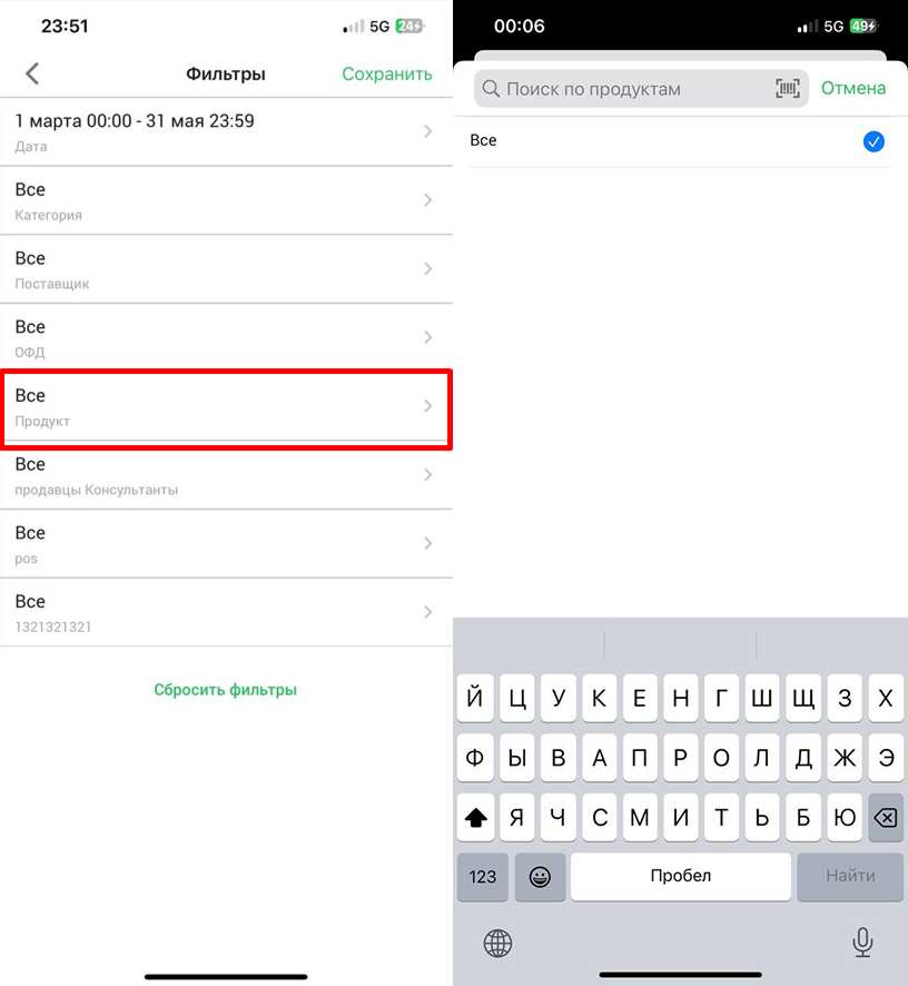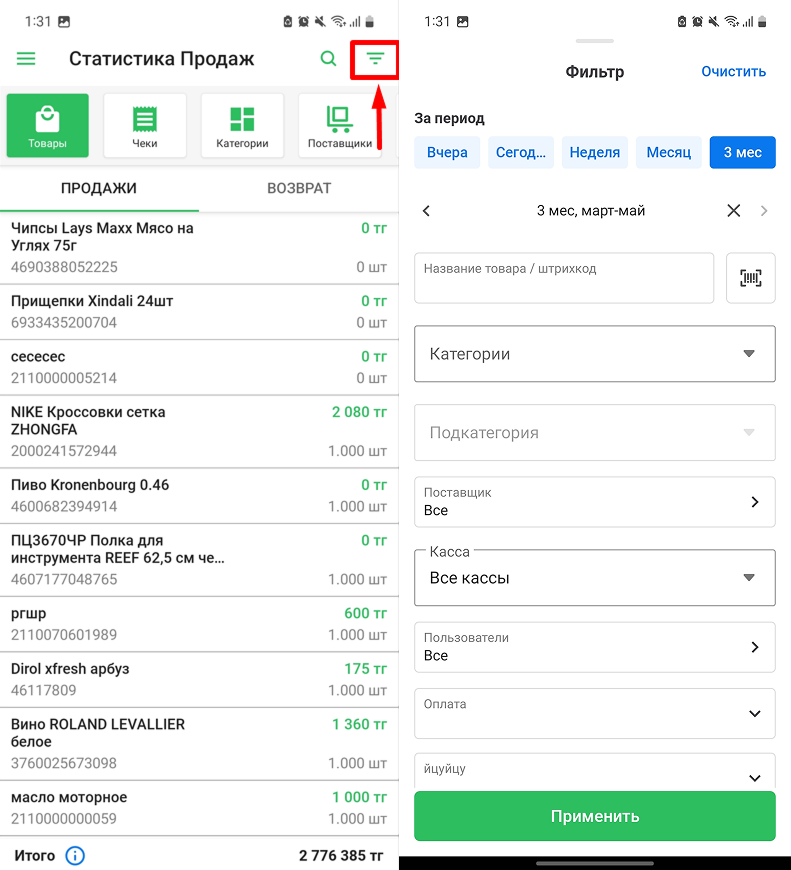 Для просмотра статистики продаж по различным критериям, таким как период,поставщик или точка продаж, просто нажмите кнопку 'Фильтр' в левом верхнем углу.