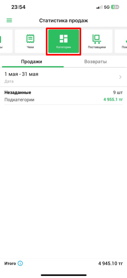В разделе “Статистика продаж” вы также можете просматривать информацию по определенным вкладкам, таким как: чеки, категории, поставщики и покупатели.