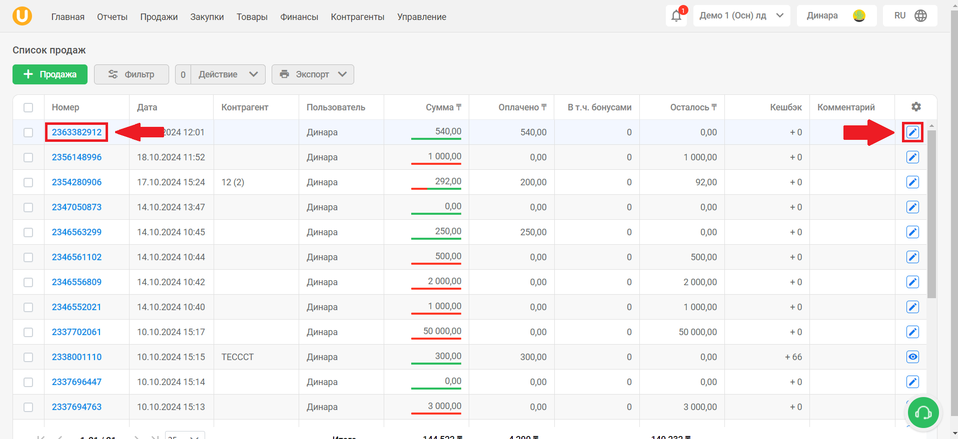 Перейдите в режим редактирования продажи на главной странице. Для этого нажмите на кнопку “📝” в правой части таблицы, либо нажмите на номер продажи.