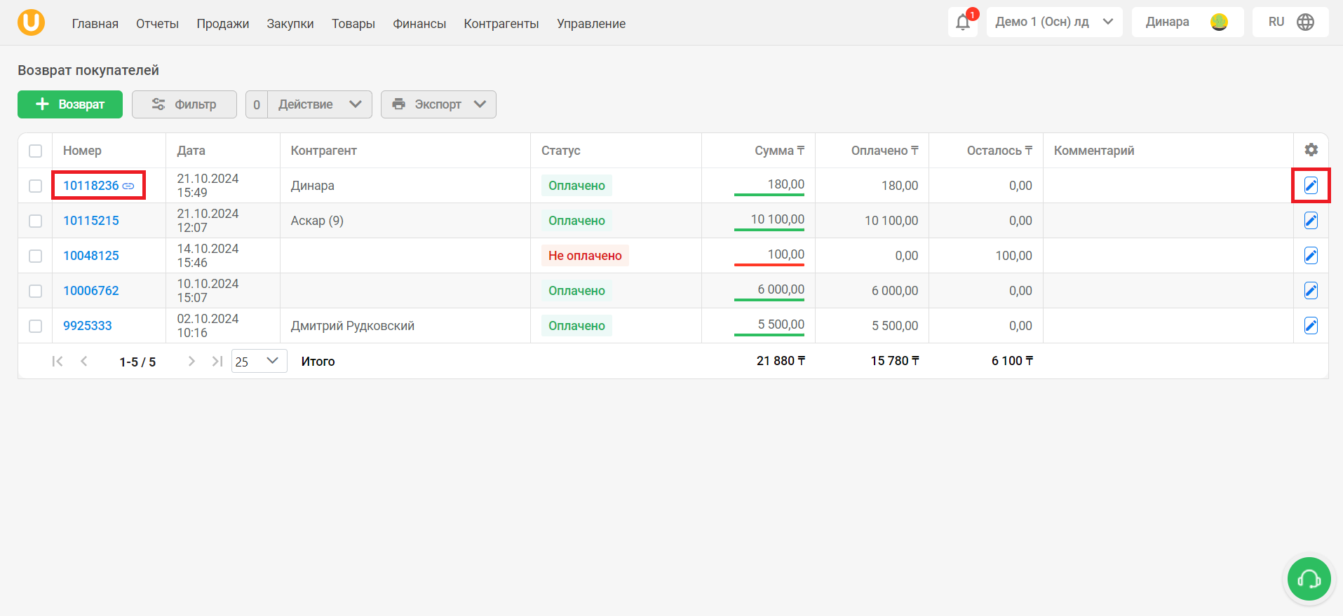 Для удаления возврата перейдите на страницу со списком возвратов. Перейдите в режим редактирования возврата на главной странице. Для этого нажмите на кнопку “📝” в правой части таблицы, либо нажмите на номер возврата.