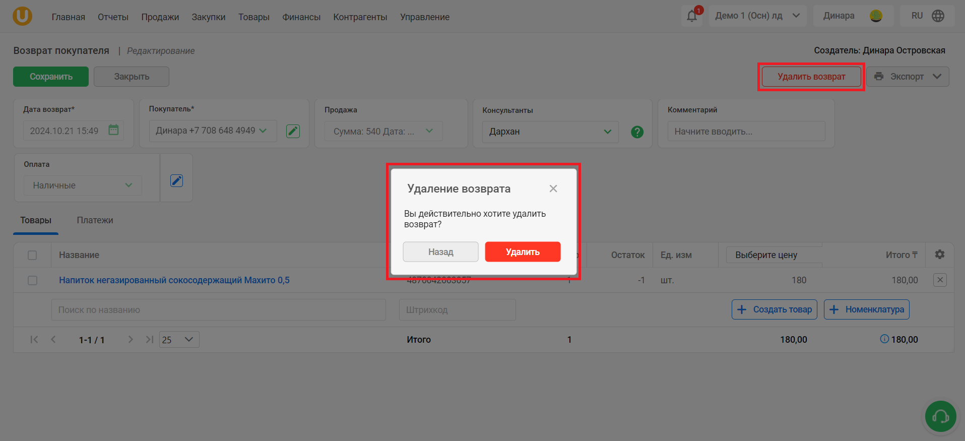 Нажмите кнопку “Удалить возврат” в правом верхнем углу страницы и подтвердите удаление, нажав на кнопку “Удалить”.