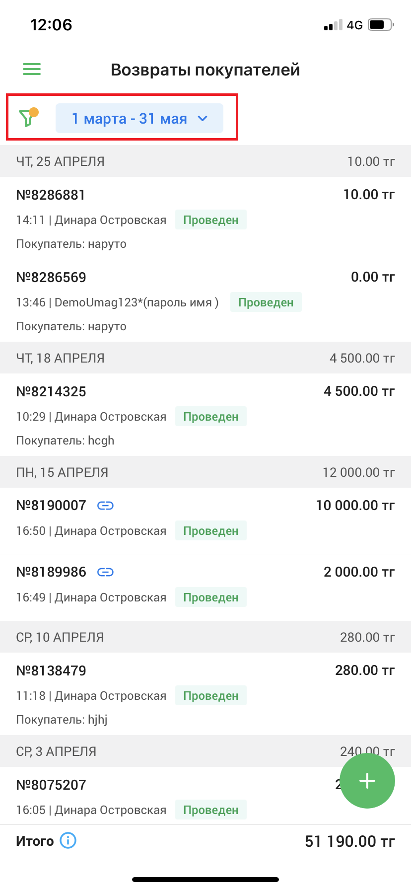 Далее, на странице возврата покупателей нажмите кнопку “➕Возврат” в левом верхнем углу страницы.