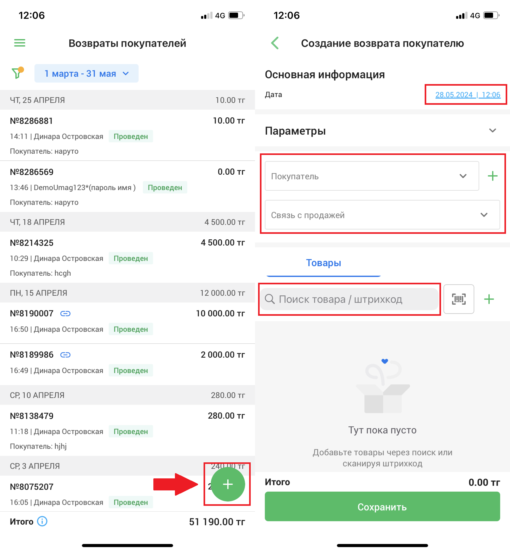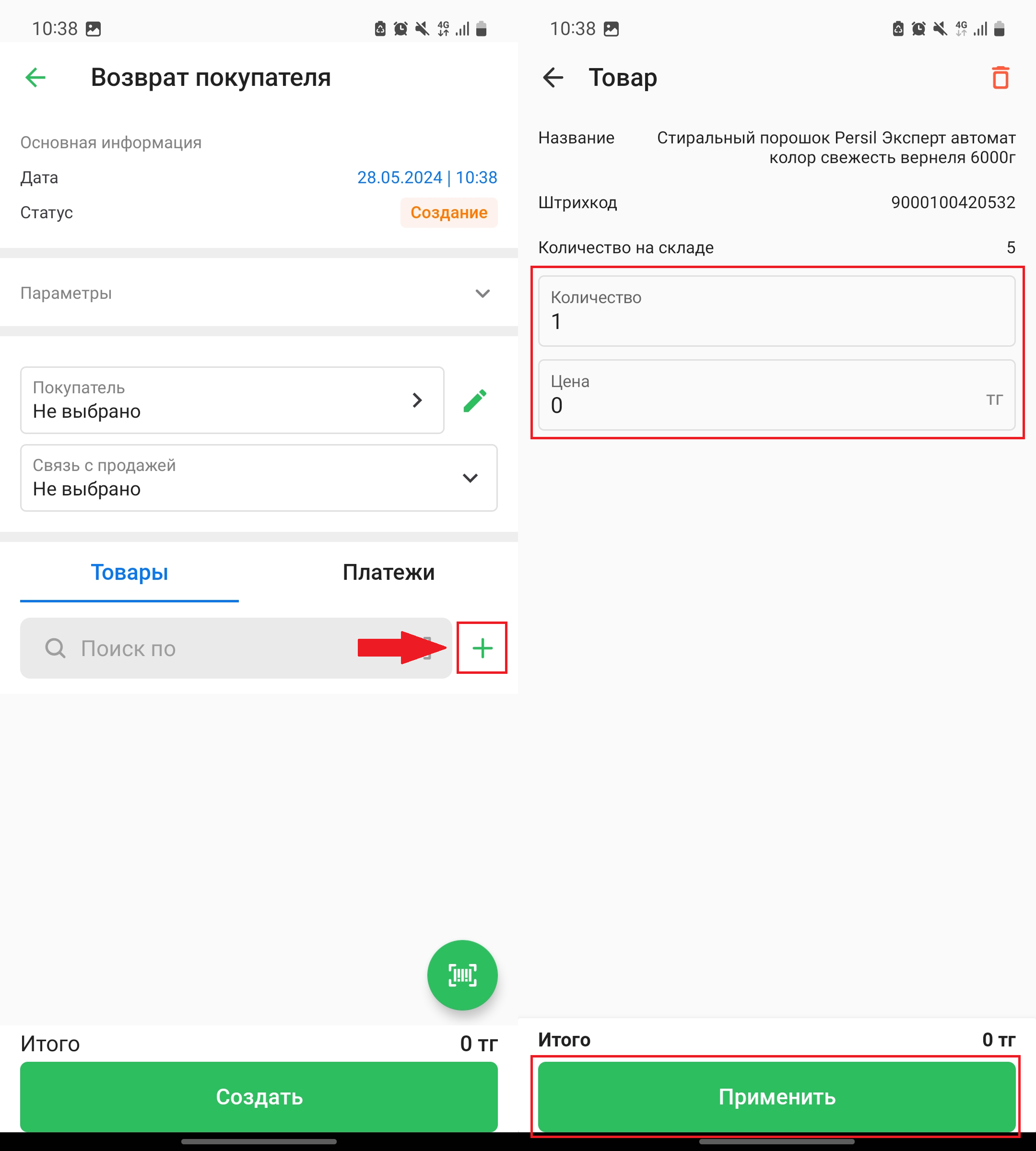 Нажмите на кнопку “➕” во вкладке “Товары”, чтобы создать новый товар и добавить его в возврат.