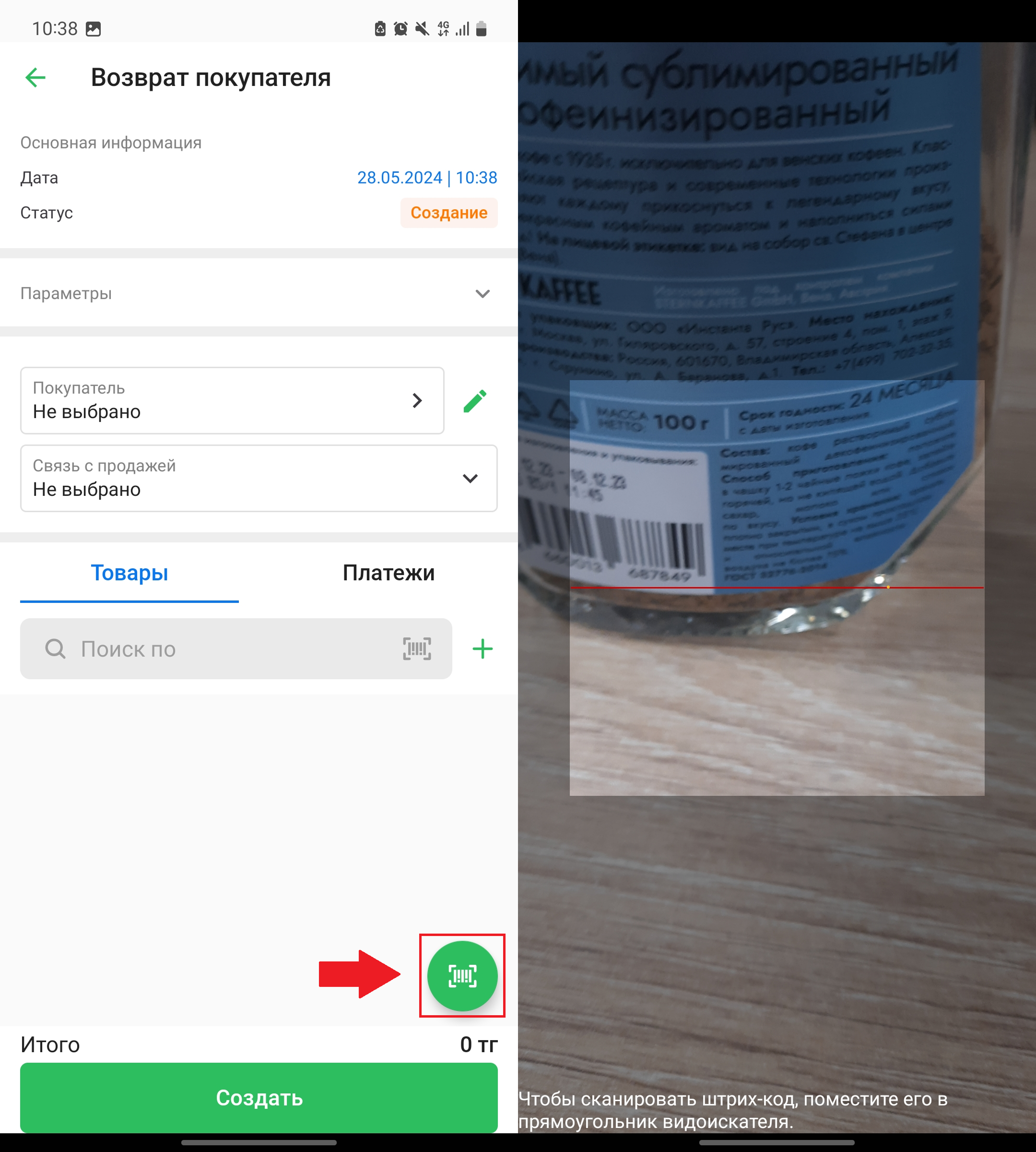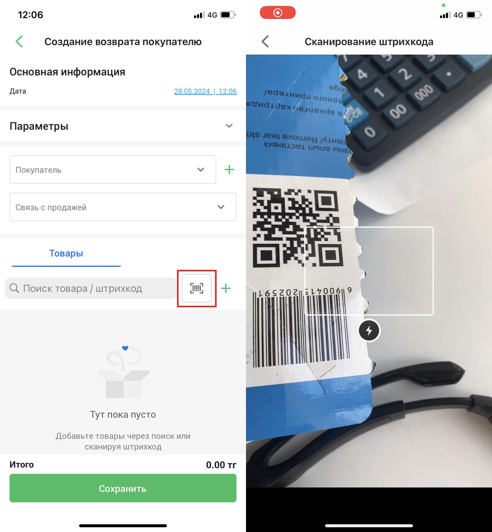 Нажмите на кнопку сканирования штрихкода в правом нижнем углу экрана, чтобы добавить товар, отсканировав штрихкод. Откроется сканер штрихкодов, наведите сканер на штрихкод, чтобы отсканировать штрихкод товара и добавить его в возврат.