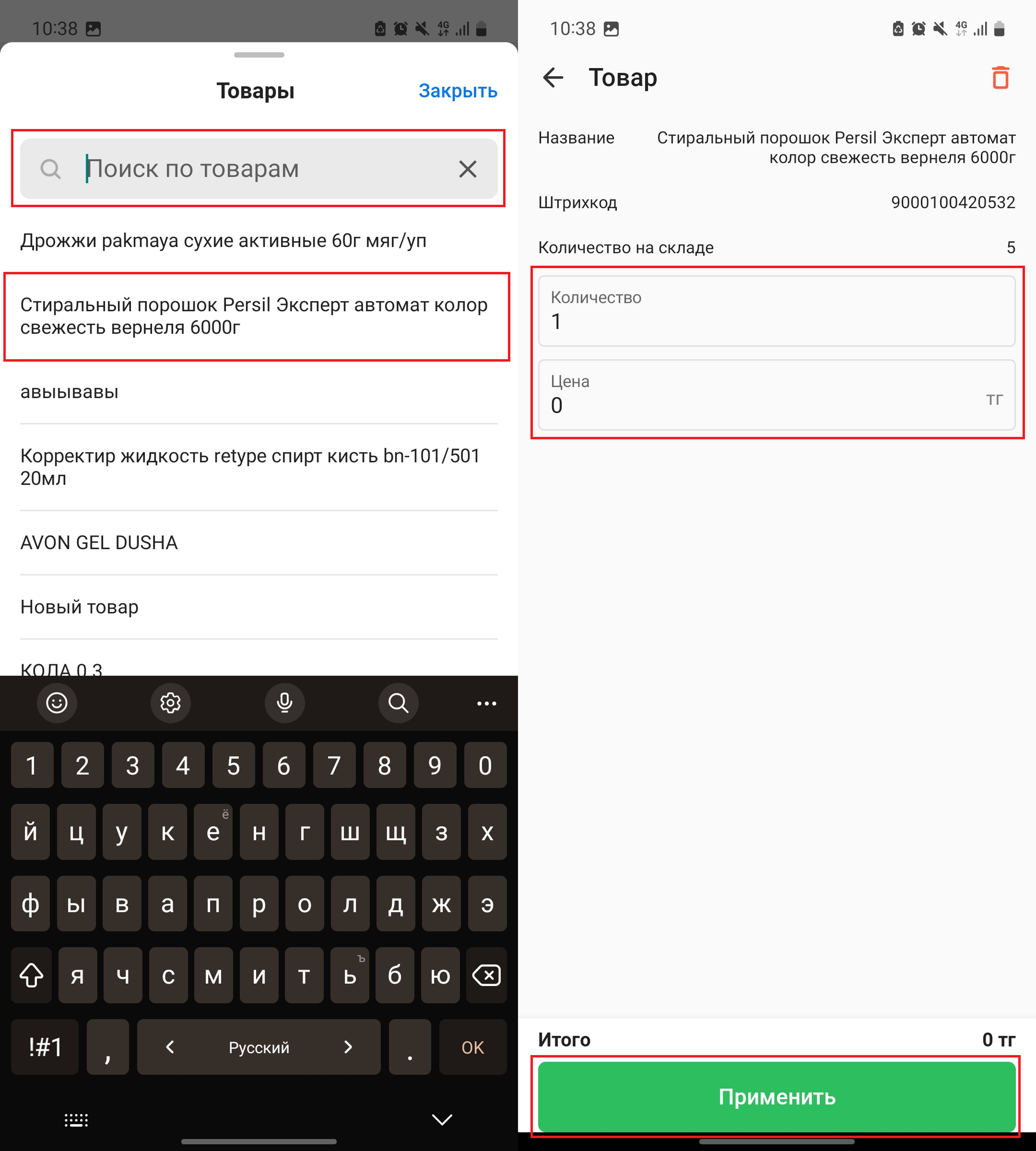 В открывшемся окне “Товары” выберите из списка товар, который вы хотите добавить в возврат. Воспользуйтесь полем “Поиск по товарам” в верхней части окна для удобства. После выбора товара, укажите количество и цену за единицу товара. Нажмите на кнопку “Применить” в нижней части страницы, чтобы добавить товар в возврат.
