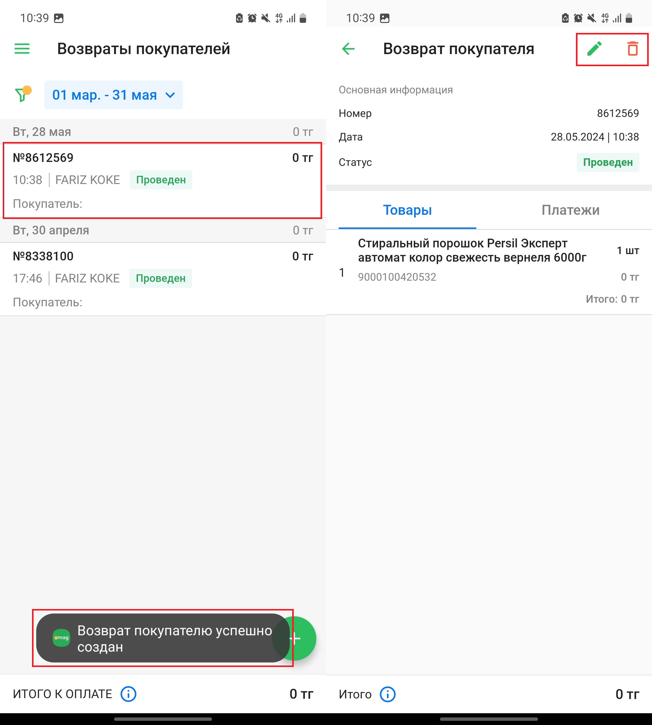 При успешном проведении возврата, вы увидите его в списке, а также уведомление “✅Возврат покупателю успешно создан”. Нажмите на возврат в списке, чтобы посмотреть подробную информацию о возврате. Нажмите на кнопку “📝”, чтобы отредактировать возврат, либо нажмите на кнопку “🗑️”, чтобы удалить возврат.