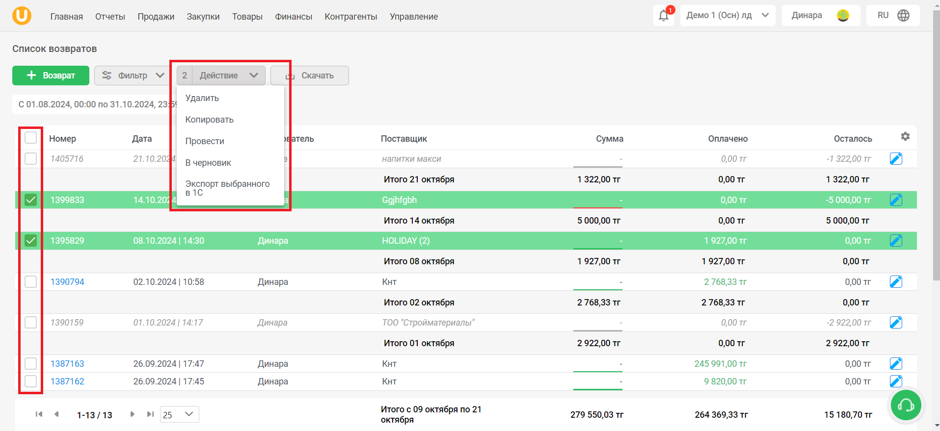 Выделите возвраты из списка и, с помощью кнопки “Действие”, управляйте списком возвратов. Вы можете удалить, скопировать, провести, отправить в черновик выделенные возвраты, а также экспортировать выделенные возвраты в 1С.