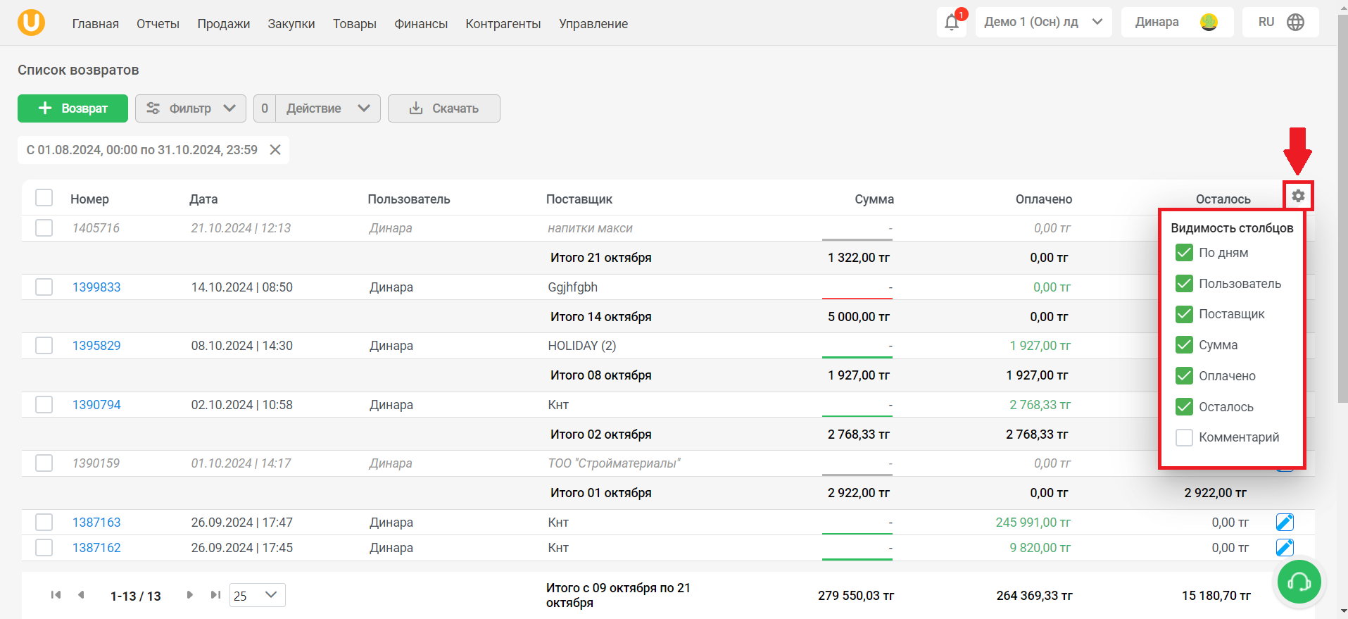 Нажмите на кнопку “Фильтр”, чтобы отфильтровать список возвратов. Вы можете отфильтровать список по дате, статусу, по пользователю, создавшему возврат, и по поставщику. Нажмите на кнопку “Очистить”, чтобы очистить фильтр, либо нажмите на кнопку “Применить”, чтобы применить фильтр.