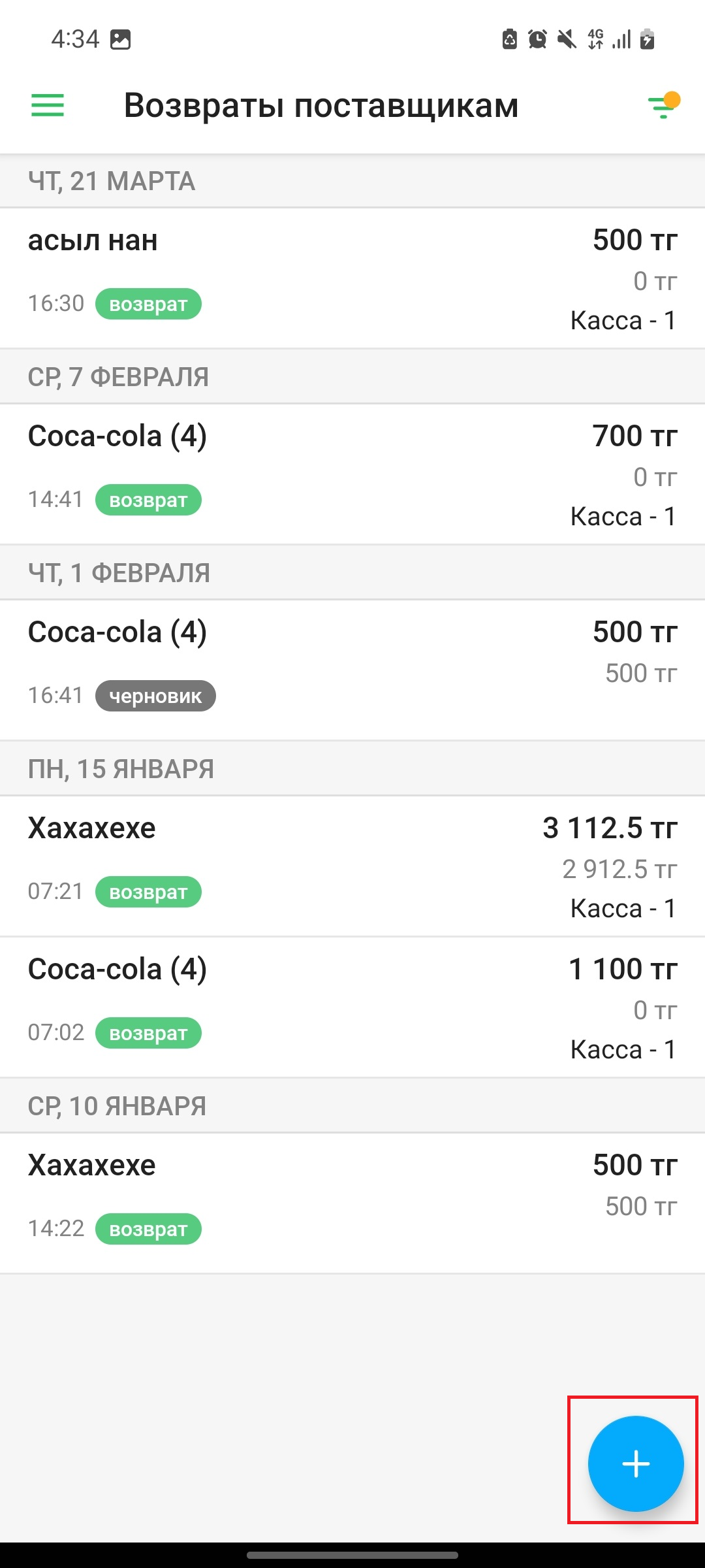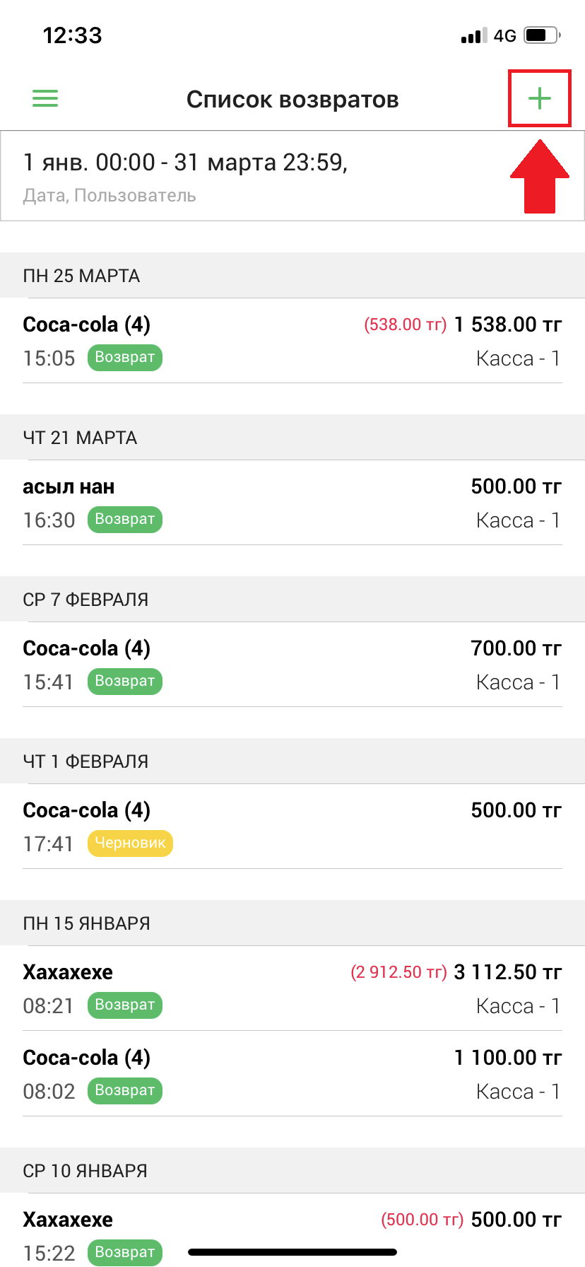 Для того, чтобы создать возврат, нажмите на кнопку “➕” в правом верхнем углу экрана.