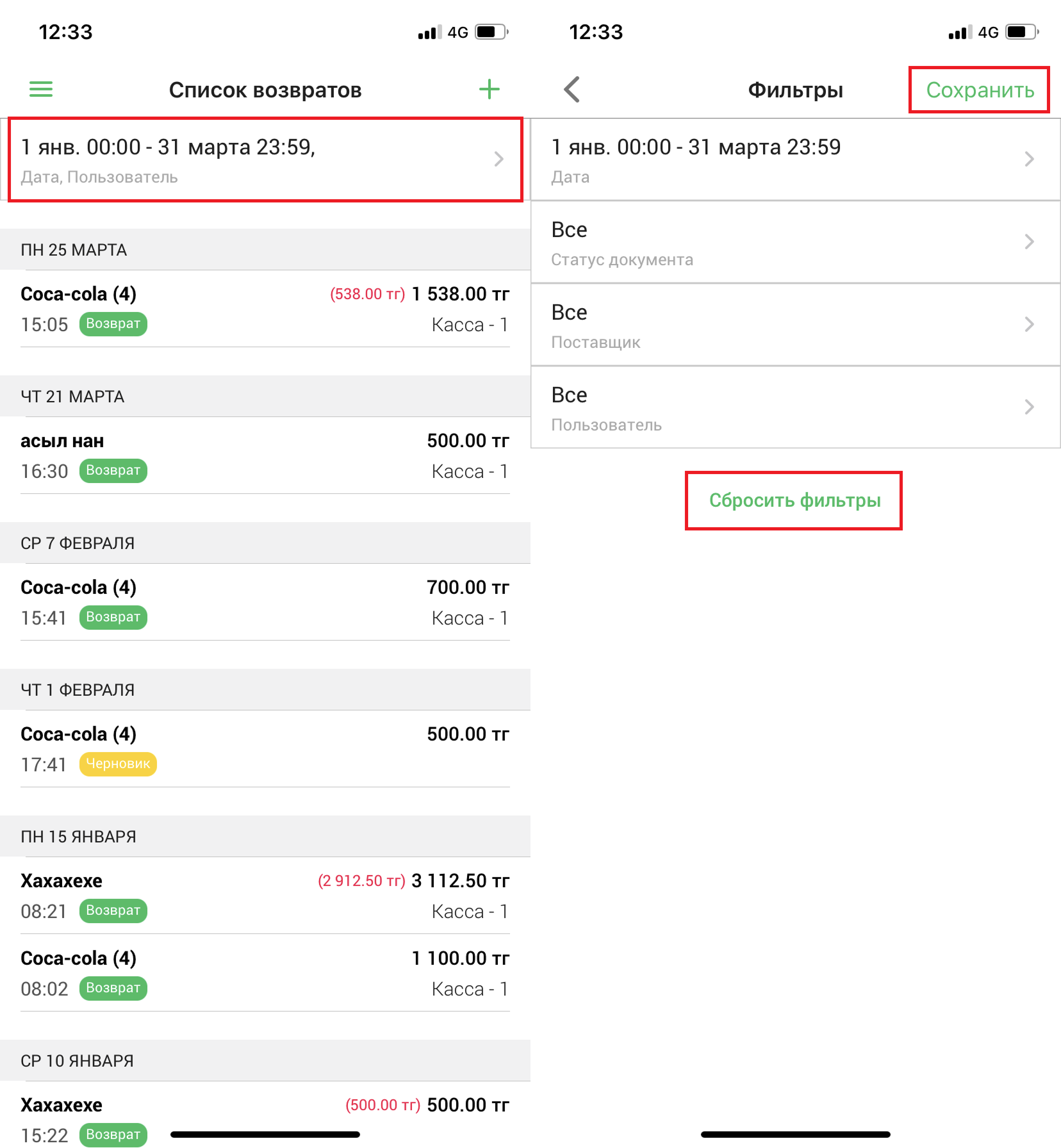 Нажмите на поле “Фильтр” в верхней части страницы, чтобы отфильтровать список возвратов. Вы можете отфильтровать список по дате, статусу, по поставщику, и по пользователю, создавшему возврат. Нажмите на кнопку “Сбросить фильтры”, чтобы очистить фильтр, либо нажмите на кнопку “Сохранить” в правом верхнем углу, чтобы применить фильтр. Примененные фильтры вы увидите в верхней части страницы.