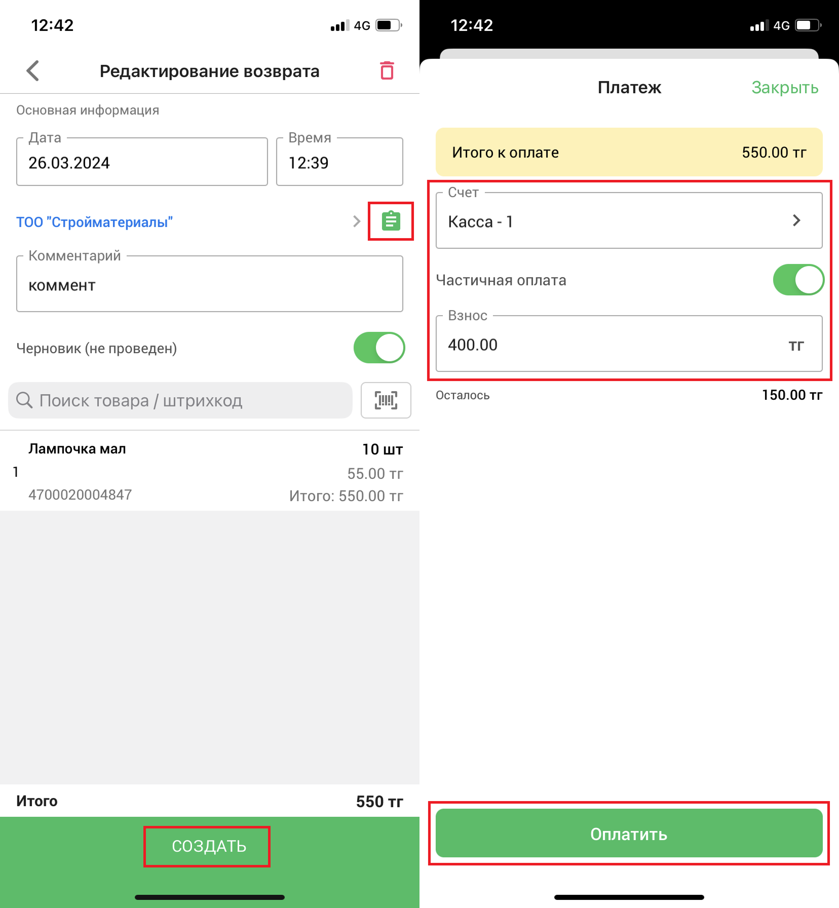 После выбора поставщика, появится кнопка для номенклатуры товаров поставщика. Вы можете выбрать необходимые товары, используя данную функцию. После внесения всех изменений, нажмите на кнопку “Создать” в нижней части страницы, чтобы провести возврат. Откроется окно “Платеж”. Выберите счет, введите сумму взноса и нажмите на кнопку “Оплатить” в нижней части окна, чтобы произвести платеж.