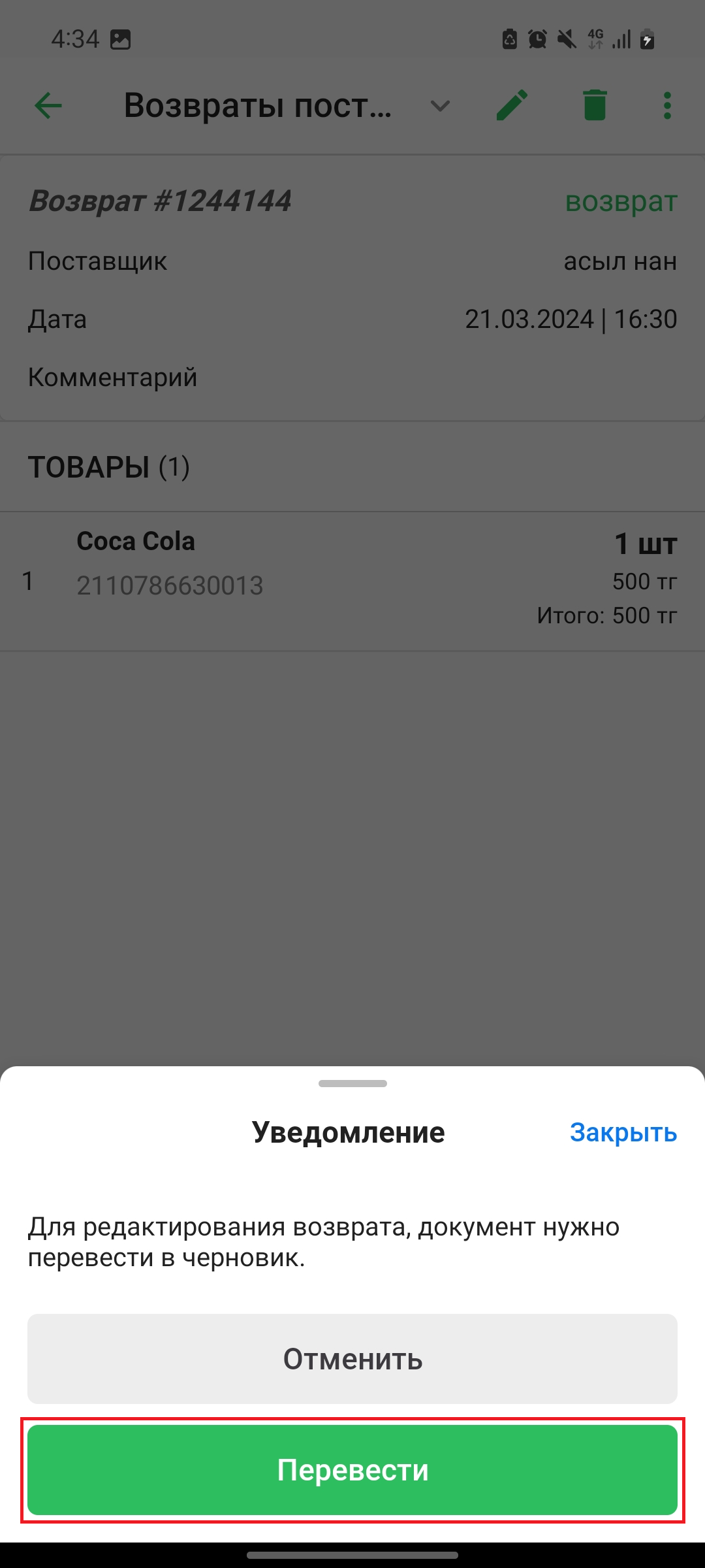 Откроется окно с уведомлением. Для редактирования возврата, необходимо перевести этот возврат в черновик. Нажмите на кнопку “Перевести”, чтобы перевести возврат в черновик, либо нажмите на кнопку “Отмена”, чтобы отменить действие. После, откроется страница “Редактирование возврата”, и вы увидите уведомление “Возврат товара успешно отменён”. Также, ползунок “ПРОВЕСТИ (не черновик)” будет в состоянии “Черновик (не проведен)”. Внесите необходимые изменения и нажмите на кнопку “Сохранить” в нижней части страницы.